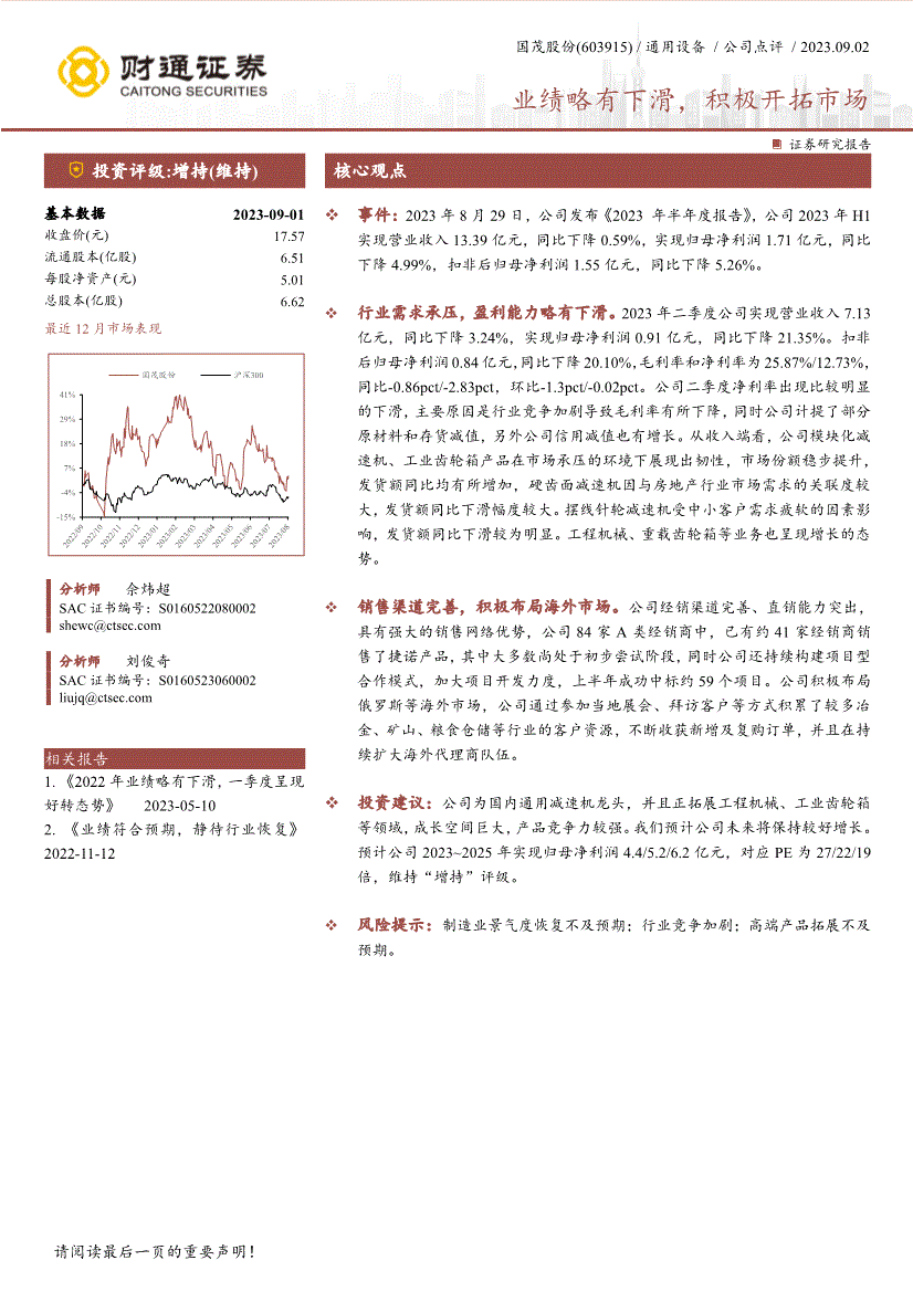 2023年二季度公司实现停业收入7。13亿元,同比下降3。24%,实现归母净利润0。91亿元,同比下降21。35%。扣非后归母净利润0。84亿元,同比下降20。10%,毛利率和净利率为25。87%/12。73%,同比-0。86pct/-2。83pct,环比-1。3pct/-0。02pct。公司二季度净利率呈现比力较着的下滑,次要缘由是行业合作加剧导致毛利率有所下降,同时公司计提了部门原材料和存货减值,别的公司信用减值也有增加。从收入端看,公司模块化减速机、工业齿轮箱产物正在市场承压的下展示出韧性,市场份额稳步提拔,发货额同比均有所添加,硬齿面减速机因取房地产行业市场需求的联系关系度较大,发货额同比下滑幅度较大。摆线针轮减速机受中小客户需求疲软的要素影响,工程机械、沉载齿轮箱等营业也呈现增加的态势。发卖渠道完美,积极结构海外市场。公司经销渠道完美、具有强大的发卖收集劣势,公司84家A类经销商中,已有约41家经销商发卖了捷诺产物,此中大大都尚处于初步测验考试阶段,同时公司还持续建立项目型合做模式,加大项目开辟力度,上半年成功中标约59个项目。公司积极结构俄罗斯等海外市场,公司通过加入本地展会、拜访客户等体例堆集了较多冶金、矿山、粮食仓储等行业的客户资本,不竭收成新增及复购订单,而且正在持续扩大海外代办署理商步队。投资:公司为国内通用减速机龙头,而且正拓展工程机械、工业齿轮箱等范畴,成漫空间庞大,产物合作力较强。我们估计公司将来将连结较好增加。对应PE为27/22/19倍,维持“增持”评级。